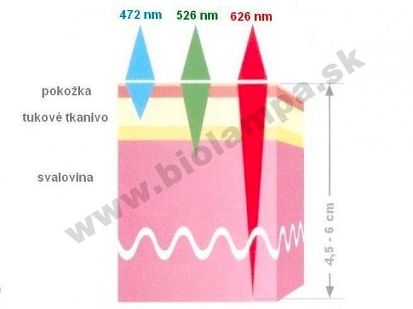A polarizált fény behatolási mélysége tehát a hullámhossztól és a fény előállításának módjától függ. E tekintetben a vörös (626 nm) polarizált fény mutatja a legjobb eredményeket (lásd az alábbi ábrát). A fény behatolása attól függ, hogy milyen szövetet világítunk meg. A kísérlet azt mutatta, hogy a zsírsejtek nagyobb arányát tartalmazó szövetek jobban áthatolnak, mint az izom, amelyben a fény a magas hemoglobin- és víztartalom miatt jobban elnyelődik. A mért eredmények alapján megállapítható, hogy a 626 nm (+/- 18 nm) spektrális karakterisztikájú fénynek rendszeres alkalmazás esetén a legjobb feltételei vannak arra, hogy kedvezően befolyásolja az élettani folyamatokat nemcsak a felszínen, hanem az emberi test szöveti struktúráiban is, egészen 4,5-6 cm mélységig.